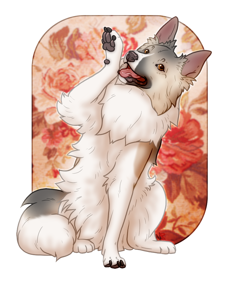 With her Shiloh Shepherd lineage, Kora has quite some long and thick fur. This long fur covers her entire body, but gets a bit longer in areas such as her neck, undersides, and legs. Though this coat is short when compared to a purebred Shiloh. Her skull holds some resemblance to a dog, being narrowed with large ears but her wolf side has made it overall larger. Kora's body type is certainly more on the muscular side, but there is still a leanness to it. The spine is curved, allowing the female to stand in a stack somewhat similar to GSDs. Her paws are wide with the paw pads and nose being a liver hue. Kor's eyes are a rich almond, taking after her wolf side.Koralia has a unique coat pattern, helping her appear more like a domestic dog than a wolf, but this white came from her father with her dame having the black and brown coloration. A white stripe goes down her muzzle, followed by a black hue in a mask-like appearance. The rest of her head is a tawny and dusty brown combo, and this formation continues in patches over her back and parts of her tail. Everything else from tail tip, bodice, and legs are a white color. This white is also all over her neck. Nails are black and slightly longer than normal, making them produce a clacking sound on rough surfaces. Kor's scent is reminiscent of cherry blossoms and lilies. Her body language is always something displaying her confidence, such as her head and tail held high.