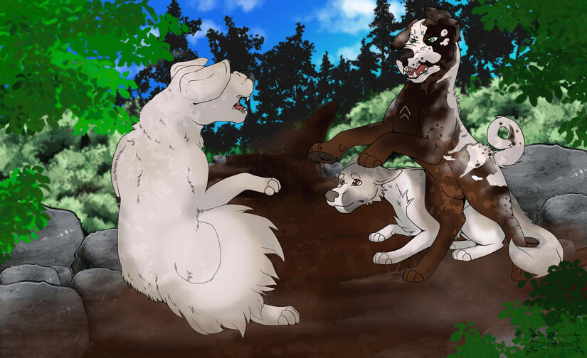 They'd eventually come to an agreement and a vow of sorts, they'd rid the world of monsters like the wolves, and keep fighting. For months, Shivshakti and Koralia kept fighting and winning each fight they had together in the ring, which unintentionally made them a favorite among the wolves. The Plush Danois' tactics were more on the brutal side while the wolfdog only helped, regardless of this, the pack loved seeing them come out on top. Throughout this, Koralia had gained an unwanted follower. A yellowish tan and gray male wolf who looked to be only months older than herself, certainly bigger and more muscular. He always followed the young female around and remained uncomfortably close to her whenever possible while remarking compliments solely about her appearance. Fortunately Shivshakti was closer in size to the strange male and he opted not to linger around while she was there. This gave Kora a feeling of reassurance, a protector-like one that she had shared with her late father once before. As weeks went by, the wolfdog took notice of a sudden change in the Plush Danois' behavior. She was growing restless and speaking more about making the wolves suffer a little more than usual. A few days later, the young female would find out why as agonized and strained howls sounded throughout the camp while she among other prisoners were permitted to roam around camp under careful supervision. In a haste she raced to find the canine in pain, among other individuals before abruptly stopping just short of a small bloody clearing. Frightened yelps and enraged snarls erupted within the crowd as the pack gathered around, unfortunately it'd be a few moments before Kora could reach the front to see what everyone else had. And it was Shivshakti, ears torn and body bloody, standing over the corpse of the pack's Beta. The Beta's lower jaw had been torn away, and she was quite clearly dead. The Dane mix stood over her, still thrashing around the wolf's limp body while smiling and laughing to herself. She was proud of what she'd just done . . . how?Just as quickly as the crowd gathered to see the panic, the pack superiors apprehended Shiv and took her away somewhere, perhaps never to be seen again while Koralia herself was thrown back into her den. For 2 days, the wolfdog laid crying in her den and fearful that she'd never see her friend again until suddenly the boulder locking them in was moved and the other female was pushed down the short incline. Upon landing harshly on her back, Kora rushed forward to nuzzle Shivshakti and cuddle into her side. But she was different, much different. Shiv didn't want to speak or move for hours until finally revealing that she had been forced to kill her father after just meeting him. The young wolfdog's heart broke for her, but despite all the support the Plush Danois received, the time afterwards was miserable. She was reduced to a mere shell of her former self, and willingly becoming a doormat for the wolves. Due to this, Shivshakti spent less time in the den and in turn, the younger wolves of the pack began to taunt Koralia, the yellowish gray wolf included. One unfortunate day just after the Dane mix was sent to clean the Alpha's dens, the strange male had slipped into their shared den to bother Kora once more. He had started out saying the usual things, complimenting her appearance and getting uncomfortably close to her, but he'd also mention how Koralia should bear his children before seizing her scruff in a swift movement. She had no time to react and was quickly sent into a panic. The male was behind her and held her firmly in place and she heard shouting during her struggle. But the voice was oddly feminine, it was Shivshakti. The brown and white canine's voice shouted and spoke as if she was actually here, it was clearer than ever and telling Koralia to fight. "FIGHT BACK! REMEMBER OUR VOW!" With newfound strength, the female began to fight back much stronger than before and with a different kind of ferocity matching that of her companion. Her head was thrown forward then back, colliding with the male's face with such impact that she was released promptly followed by a pained groan.It wasn't long before the wolf went back to fighting, diving forward and biting into the female's face as she twisted her bodice into a position where she could land a powerful hind kick to the male's face, and then another with her forepaws to stun him. He was indeed stunned, but not for long as lunged forward to bite Koralia once more. The male had seized her scruff again to thrash her around by before intimately pinning her to the ground on her back, the only thing he could think to do as she struggled fiercely against him. Twisting and landing kicks to the wolf's underside was enough to get him to move, and the exact amount of time she needed to turn and slide underneath him once more. Knowing that the male wasn't ever gonna give up, Kora frantically bit into the first thing she saw, which happened to be his family jewels that she pulled against with all her might. The wolf let out a loud yelp as skin and nerves was torn away and a bloody lump of flesh was tossed aside effortlessly, bleeding furiously, he turned to flee. But quick to rise to her paws, Koralia didn't let him leave without giving even more of a brutal mauling with bites to his face, throat, and chest. Eyes wild, she'd snarl at his fleeing figure. "Fuck you and your kids!" And just as he left, Shivshakti had appeared and was returning to their den, casting the wolfdog a bewildered look. "He had ill intentions and he fucking paid the price for it." Kor huffed at her, and after hearing what the wolf tried to do, she shared her anger. At last, the old rebellious, always fighting Dane mix was back to her senses and prepared to continue fighting in their lifelong war that had she not inspired Kor, they wouldn't be in, in the first place. Shivshakti's fierce spirit was what kept Koralia going, and she'd continue to do j